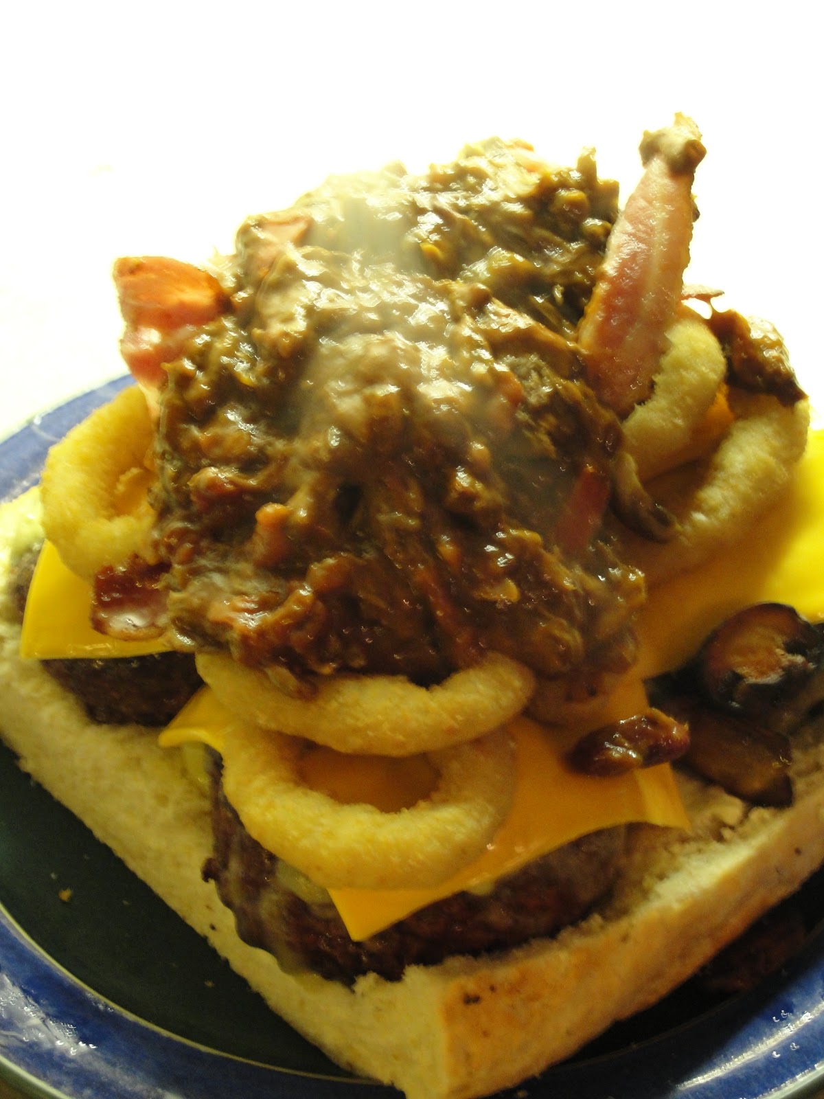 Four half-pounder beef burgers, packet of streaky bacon, portion of beef-chilli, mushrooms, onion rings, cheese and a big roll loaf to put it all in.